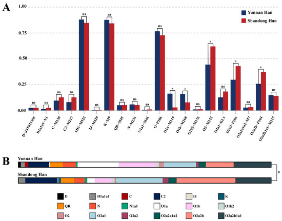 Allelic frequency and haplogroup distribution determined for 24 Y chromosomal single-nucleotide polymorphisms (Y-SNPs) in Yunnan and Shandong Han populations. (A) Frequencies for 20 Y-SNP loci with derived allele. Yunnan Han population is represented by blue bars, while Shandong Han population is represented by red bars. “*” and “ns” denote if the allelic frequency comparison is significant or not, respectively. (B) Distribution of Y chromosome haplogroups. Different haplogroups are presented with different colors. The upper bar is the haplogroup distribution of Yunnan Han, and the lower one is that of Shandong Han. “#” denotes a significant difference in haplogroup distribution.