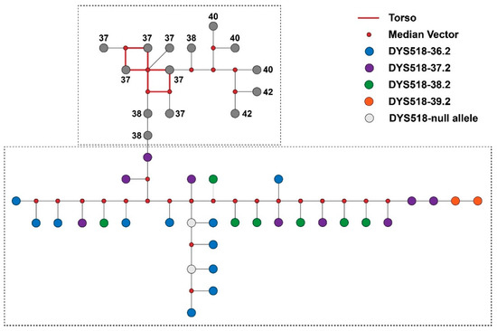 Interestingly, among the 69 samples with micro-variants, 29 carried “.2” mutation at DYS518, which were all found to be descents of QR haplogroup ancestors, accounting for 64.4% of individuals assigned to the QR-M45 haplogroup. Albeit it has been concluded that the QR haplogroup is not a major haplogroup of the East Asian population [65], 92.2% of the reported “DYS518~.2” mutations were found in Chinese samples in the YHRD database. Additionally, Lang et al. found a relationship between the “DYS518~.2” alleles and the haplogroup Q [66]. In order to define the evolutionary history of the “DYS518~.2” allele, the median-joining network was utilized to construct the inner structure of the QR-M45 haplogroup (Figure 4). The ancestral structure is indicated by the red torso of the network, with unmutated event at DYS518, indicating the allele 37 was possibly the ancestral allele. All nodes of the samples are linked so to form two independent clusters. In addition, two nodes for allele 37.2 and other two nodes for the unmutated allele 38 are located closely at the joint of two clusters. The closeness of these samples indicated that “DYS518~.2” alleles likely derived from the mutated allele 37.2, which might be characteristic for the QR haplogroup in Chinese populations. However, the underlying evolutionary pathway leading to the shift of unmutated allele 38 to mutated allele 37.2 remains unclear. In order to explain this observation, more samples from the QR haplogroup should be collected and profiled utilizing massive parallel sequencing technology. A higher resolution definition of Y-DNA paragroups will provide insights for a comprehensive knowledge of Y-STR haplotype evolution in ancient major haplogroups.