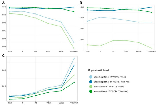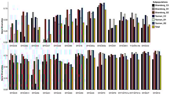 To uncover the varying patterns of Y-STRs within haplogroups from different populations, three major haplogroups, i.e., C2, O1, and O2 were selected, to which the majority of the Shandong and Yunnan Han samples belonged (Figures S1–S3).