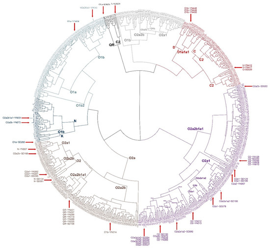 Four haplogroups—O1a, O1b, O2a1, and O2a2b, were characterized by dominant but different distributions in the two populations. The O1a haplogroup is mainly distributed in southern China, Malaysia, Vietnam, and Indonesia males. The O1b haplogroup is unique to modern Eastern Eurasian populations. Previous findings indicated that the proportion of the O1 haplogroup is significantly higher in southern China compared with northern China [54], which was also confirmed in this research. In contrast, the two haplogroups O2a1 and O2a2b, which are also dominant in East Asian populations [55], had relatively higher proportions in the Shandong Han population.