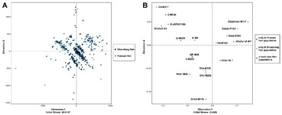 Significantly, the structures observed in the MDS plots were different. Figure 8A demonstrates that the 27 Y-STR loci were not able to distinguish Han males in Shandong and Yunnan populations (Figure 8A), because most individuals clustered together. However, the 24 Y-SNPs showed potential to clearly classify male individuals as various haplogroups (Figure 8B). In addition, individuals assigned to the C-M130 and D-JST021355 haplogroups were all from Yunnan Han population, while those belonging to the K-M9 haplogroup were all from Shandong Han population, indicating the possible bio-geographic discrimination ability of Y-DNA-haplogroup-determining SNPs.
