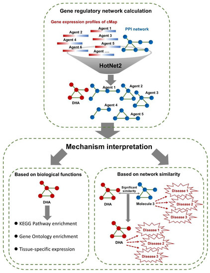 In this study, we first performed calculations with HotNet2 to construct the gene regulatory networks of connectivity map (cMap)-derived agents (including DHA) based on their gene expression profiles and PPIs (Figure 1). Then, we interpreted the disease intervention mechanism of DHA by performing biological functional analyses for the regulatory network-containing genes (Figure 1). Next, by comparing the similarities of the gene regulatory networks of DHA and those of other cMap-derived agents, we identified some agents similar to DHA (Figure 1). Because some of these similar agents have clear indications and treatment mechanisms, we can predict the potential target diseases and intervention mechanisms of DHA by analogy.