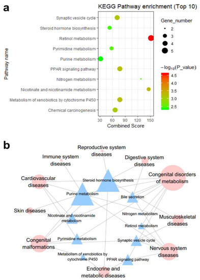 As shown in Figure 3b, according to the disease association annotations with the pathways in the KEGG pathway database, the top 10 significant KEGG pathways enriched with genes in the DHA-regulated network are associated with different disease classes (Figure 3). For example, eight pathways are related to the disease class “congenital disorders of metabolism”, which is the disease class that involves the most pathways. The disease class “congenital malformations” has the second most pathways, with five. Consistent with our predictions, a study conducted by Manley et al. on fish oil supplementation in infants showed that for infants born at <33 weeks of gestation, DHA supplementation can reduce the incidence of bronchopulmonary dysplasia in boys and in all infants weighing <1250 g [24]. In addition, a random double-blind study conducted by Helland et al. showed that supplementation of ω-3 PUFA during pregnancy and lactation may be beneficial to the intellectual development of the children at 4 years of age [25]; in addition, Lauritzen et al. found that maternal supplementation with fish oil during the first four months of lactation can positively affect the intellectual development of female children [26]. Dunstan et al. found that children whose mothers received supplementation with high levels of DHA during pregnancy had significantly better hand-eye coordination than children in the placebo group [27]. Therefore, the above pathways deserve further attention when studying the congenital disease intervention mechanism of DHA.