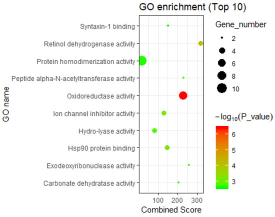 In addition, these DHA-regulated genes are significantly related to the GO molecular function “retinol dehydrogenase activity” (p-value = 8.81 × 10−5) (Figure 4). Ma et al.’s study showed that mutation of retinol dehydrogenase is associated with nonalcoholic fatty liver disease, and retinol dehydrogenase plays a role in nonalcoholic fatty liver disease through its enzymatic activity [37]. Therefore, genes in the functional category “retinol dehydrogenase activity” (i.e., ADH1A, RDH5, and DHRS3) are worthy of attention in the study of the anti-cardiovascular disease effects of DHA.
