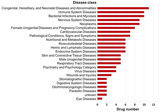 Additionally, according to the NCBI Medical Subject Headings (MeSH) database (https://www.ncbi.nlm.nih.gov/mesh/), the standardized disease descriptions of agent indications can be divided into 24 disease classes. Through the integrated analysis of disease classes for the indications of the 20 similar agents listed above, we found that they were most strongly associated with the disease class of “congenital, hereditary, and neonatal diseases and abnormalities”, which involves 11 agents. Second, there were 10 agents each related to the disease classes of “bacterial infections and mycoses” and “immune system diseases”; third, there were 9 drugs each related to the disease classes of “neoplasms” and “nervous system diseases” (Figure 6). Accordingly, we inferred that prevention of congenital diseases, prevention of neoplasms, immune system protection, and neurological regulation are the most fundamental biological effects of DHA, which is consistent with the findings of previous studies.