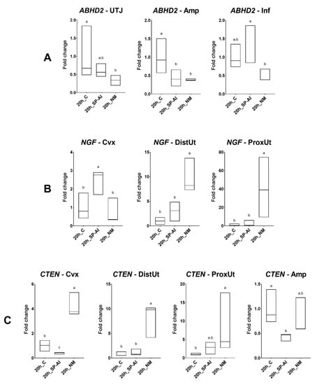 Results of Experiment 1. Gene expression of (A) ABHD2, (B) NGF, and (C) CTEN was statistically significant (p < 0.05) in the rabbit endocervix (Cvx), distal uterus (DistUt), proximal uterus (ProxUt), utero-tubal junction (UTJ), ampulla (Amp), and infundibulum (Inf) 20 h after the induction of ovulation with an intramuscular injection of 0.03 mg gonadotropin-releasing hormone (GnRH) (20 h_C, n = 3), 20 h post-GnRH-stimulation and seminal plasma vaginal infusion (20 h_SP-AI, n = 3), and 20 h post-GnRH-stimulation and natural mating (20 h_NM, n = 3). Fold changes relative to the control of the ovulation group are shown. Different letters (a,b) represent statistical differences between groups (p < 0.05). Median [minimum, maximum].