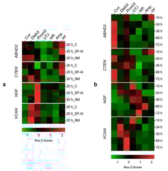 Gene expression changes among tissues in the different groups included in the study. Changes in ABHD2, CTEN, NGF, and VCAN expression among different tissues (endocervix, Cvx; distal uterus, DistUt; proximal uterus, ProxUt; utero-tubal junction, UTJ; distal isthmus, Isth; ampulla, Amp; and infundibulum, Inf) (a) at 20 h after the induction of ovulation with 0.03 mg of gonadotropin-releasing hormone (GnRH) intramuscularly, as the control of ovulation (20 h_C); 20 h post-GnRH-stimulation and sperm-free seminal plasma vaginal infusion (20 h_SP-AI); and 20 h post-GnRH-stimulation and natural mating (20 h_NM); (b) at 10, 24, 36, 68, and 72 h post-GnRH-stimulation and natural mating. Row Z-Scores of the mean fold change relative to the reference group (UTJ) are shown. Red indicates upregulation and green indicates downregulation.