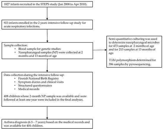 This study consist of the 473 children from STEP-study follow-up group whose nasopharyngeal sample was taken on the annual visit of study clinic at 2 months of age (Figure 1). Nasopharyngeal samples were collected during prescheduled visits at the age of 2 (average age 2.6 m), 13, and 24 months. Blood samples for genetic studies were collected at the 2-month visit [12].