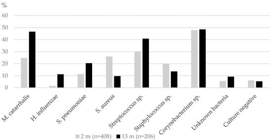 After birth, neonates rapidly acquire a vast number of microbes in different places of the body. Nasopharyngeal bacteria can asymptomatically colonize the nasopharynx of infants and young children but are also associated with the development of respiratory infections during infancy and asthma during childhood. Such nasopharyngeal bacteria include S. pneumoniae, M. catarrhalis, and H. influenzae [2,18]. It is known that the NP bacterial colonization is dynamic over the first years of life. Our finding that the colonization rates of common bacteria in NP samples change within the first year of life in Finnish children is in line with previous studies [19].