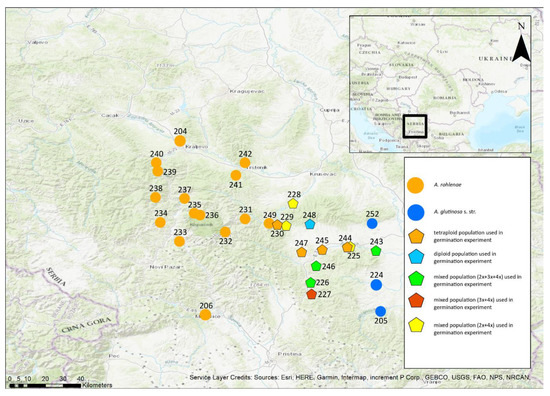 In this study, we focus on the previously discovered hybrid zone between the diploid A. glutinosa s. str. and its autotetraploid A. rohlenae in Serbia (see [17,18]). We analysed the evolutionary processes operating in the hybrid zone using several approaches. (1) We used flow cytometry to determine the frequency of the occurrence of diploid, triploid and tetraploid taxa. (2) Using cpDNA variation, we determined the direction of the hybridisation process, as cpDNA is maternally inherited in most angiosperms [20], and we also reconstructed a phylogenetic tree of the two species and their putative hybrid within the study area. (3) Using analyses of microsatellite variation, we determined the genetic composition of individual species. (4) To estimate the fitness of each ploidy, we tested each ploidy level in a germination experiment. (5) To evaluate whether the triploid individuals originated solely due to hybridisation between diploids and tetraploids, we analysed the ploidy level in all the seedlings obtained in a germination experiment.