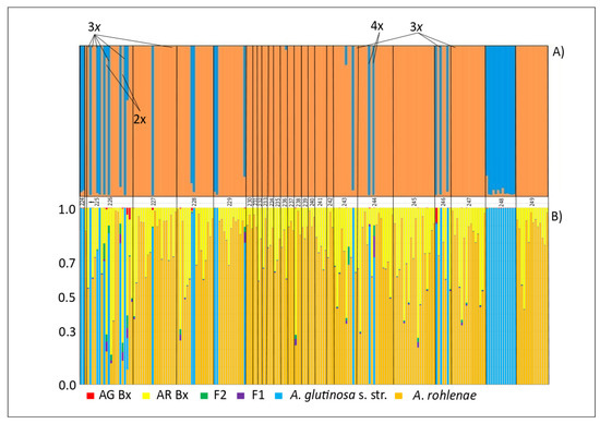 NEWHYBRIDS 1.1 [48]-estimated Bayesian posterior probabilities were generated by a Markov chain Monte Carlo method for the purpose of classifying hybrids into six genotype frequency classes—in our case, pure A. glutinosa s. str., pure A. rohlenae, F1 hybrids, F2 hybrids, F1 hybrid backcrosses to A. glutinosa s. str. (AR Bx) and F1 hybrid backcrosses to A. rohlenae (AG Bx). The microsatellite data were transferred to a binary matrix based on the presence/absence of particular alleles. One pure diploid (248) and one pure tetraploid (233) population were chosen as the outgroup for prior information (“z option”) to determine in advance to which genotype frequency category they belonged. Then, ten independent runs of 1,000,000 iterations after a burn-in of 100,000 iterations were used.