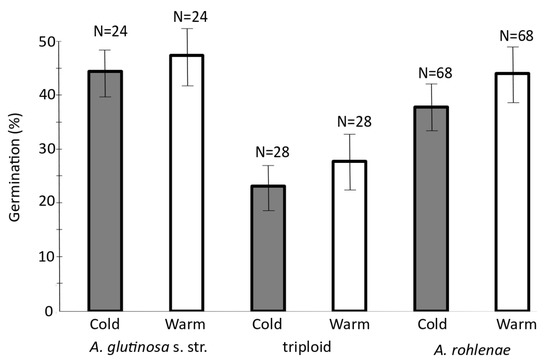 The following are available online at https://www.mdpi.com/2073-4425/11/7/770/s1. Table S1: Locality details of Alnus accessions sampled; Table S2: Differences in germination between Alnus glutinosa s. str., A. rohlenae and triploids in both climatic regimes; Table S3: General overview of germinated triploid seeds.