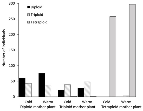 Diploid and triploid individuals produced many seedlings of the same ploidy level, but with a significant number of exceptions. Besides diploid offspring, the diploid mother plants always produced a few triploid seedlings. Meanwhile, in addition to diploid and triploid seedlings, the triploid mother plants also produced a few tetraploid seedlings. Furthermore, one putatively aneuploid seedling (a ploidy level intermediate between triploid and tetraploid) germinated from the seeds of a triploid individual—sample 246g1201. Tetraploid parents almost exclusively produced tetraploid offspring, except for population 244 under the warm treatment. Here, three triploid seedlings were found (Figure 6). Therefore, we conclude that triploids can arise from both species as well as from triploids.