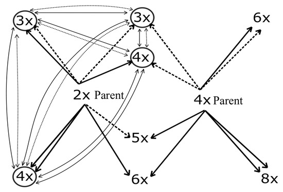 The hybridisation of Chamerion angustifolium revealed the formation of triploids from 2x × 2x, 2x × 3x, 4x × 3x and 2x × 4x crosses, in different proportions. However, the triploids arose with least probability from 2x × 2x crosses by the fusion of unreduced gametes [50,59], while 2x × 3x and 2x × 4x crosses are generally more successful for triploid formation [51,59]; the estimated frequency of unreduced gametes in autopolyploid species is 0.005%. Nevertheless, such estimates vary between species and may also involve environmental effects [50].