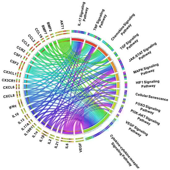 KEGG pathway enrichment analysis identifies the enrichment of inflammatory cytokine and IL17 signaling in IDD: The Circos plot represents significantly enriched pathways associated with regulated genes in the IDD detected using our functional enrichment analysis. The hallmark genes and associated pathways are color coded and were represented using a specific color in the inner ring. The ribbon/arc that originates from different genes and terminates at associated KEGG pathways demonstrates the connectivity of genes and KEGG pathways. However, the outer ring is composed of multiple color bars (color belonging to the inner ring represents specific genes and KEGG pathways) and represents different genes enriched in a specific pathway or different KEGG pathways shared by a single gene. The distinction between genes and pathways shown in circular layout were shown by the space between the two outer rings. When there is a space between the two outer rings, it demonstrates the representation of genes, whereas when both outer rings are connected, it represents the enriched KEGG pathway.