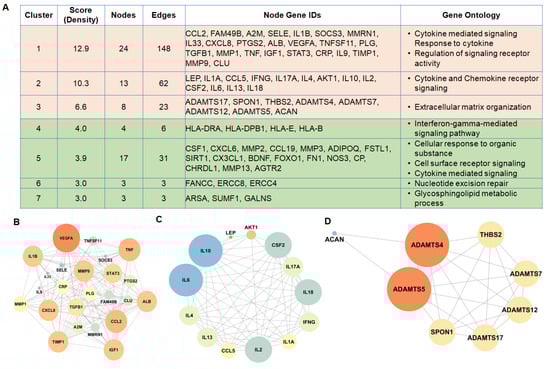 Cluster/module analysis in PPI network reveals the abundance of organized networks of cytokines and chemokines signaling: PPI network of IDD-related genes was constructed using the STRING database utilizing experimentally validated interactions with a combined PPI score of > 0.7. Sub-network analysis in the PPI network using MCODE identified the significant modules/clusters. (A) The cluster analysis in the PPI network resulted in 7 clusters, which include 72 nodes and 276 edges and enrichment of several GO terms for biological processes. (B) Cluster 1, (C) Cluster 2, and (D) Cluster 3 of the top three network clusters in the sub-network analysis of PPI networks of IDD-related genes. The cluster networks were visualized by Cytoscape (version: 3.7.1) by mapping the ‘degree parameter’ to node size and color. As the node size increased and color changed from light to dark, the value of the connectivity degree of node genes increased. All nodes are significantly enriched at an adjusted p value < 0.05.