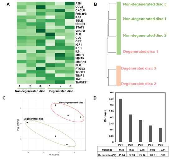 Since cluster analysis of the interaction network indicates the relevance of cytokine and chemokine receptor signaling in IDD pathophysiology, we next determined the expression profile of these genes in independent datasets obtained from human discs that are also available in the public domain. To this end, all 24 genes were selected from the MCODE cluster 1 for their expression analysis in the microarray dataset (GSE34095), which included data from three healthy and three degenerated human discs. A heatmap analysis revealed differential expression of these genes, which discriminate well between healthy and diseased disc tissue (Figure 5A). The expression levels of CCL2, AKT1, STAT3 and VEGFA were significantly lower in the degenerated disc, whereas expression of CXCL8, IL2, FAM49B and PLG were significantly higher in degenerated human discs compared to healthy discs, suggesting that these genes might play a role in IDD pathogenesis (Figure 5A). We next evaluated whether changes in the expression profile of these 24 genes were sufficient to distinguish degenerated disc samples from non-degenerated control samples. For this, hierarchical clustering was performed and the resulting dendrogram clearly placed all three non-degenerated samples as one self-contained group distinct from two degenerated samples (disc 2, and 3) (Figure 5B). This result highlights that the expression profiles of 24 genes in network cluster 1 for non-degenerated discs are more similar to each other than the profile of degenerated samples indicating the possibility of IDD-specific gene expression. Although degenerated disc 1 clustered together with non-degenerated discs, this could be due to the variation in disease severity and degree of disc degeneration. Additionally, principal component analysis (PCA) was performed using these 24 differentially expressed genes. Interestingly, this analysis created two principal clusters that segregate the samples in accordance with their disease status: degenerated or healthy (Figure 5C). To further substantiate the correlation of variations of gene expression with IDD, we compared the resulting principal components with the disease status. The results showed that, together, PC #1 and PC #2 accounted for 57% of the variance in the data set and correlated well with IDD status of the subject (Figure 5D). Altogether, these results indicate that human intervertebral discs undergo reproducible and discernible transcriptomic changes of these 24 genes in the setting of IDD. Therefore, our analysis is indicative of distinct IDD-specific changes in the transcriptome of disc tissue, suggesting that these 24 genes (present in network cluster 1) may potentially constitute a transcriptomic signature of IDD pathogenesis.