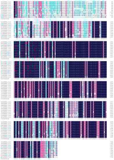 Sequence alignment and comparative analysis of LETM1 among different plants based on amino acid sequences. GhLETM1: LETM1 of Gossypium hisutum; GaLETM1: LETM1of Gossypium arboreum; GrLETM1: LETM1 of Gossypium raimondii; TcLETM1: LETM1 of Theobroma cacao; VvLETM1: LETM1 of Vitis vinifera; JrLETM1: LETM1 of Juglans regia; JcLETM1: LETM1 of Jatropha curcas; PeLETM1: LETM1 of Populus euphratica; CuLETM1: LETM1 of Cucumis; AtLETM1: LETM1 of Arabidopsis thaliana.
