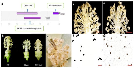 (a) The prediction results of the GhLETM1 protein structure. (b) The flower phenotype of the WT and OE/RNAi transformants. (c) Shortened filaments in the OE and RNAi transformants. (d) Normal dehiscence anthers under a stereomicroscope. Scale bars = 4 mm. (e) Partial indehiscence anthers under a stereomicroscope. Scale bars = 3 mm. (f) Normal pollen activity of the WT plant. (g) Pollen from indehiscence anthers are abortive without activity in the GhLETM1 transformants. Scale bars = 500 μm.