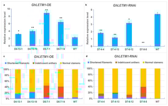 (a,b) The relative expression level analysis of the GhLETM1 gene. Black asterisks indicate statistically significant differences between the WT plant and transgenic plants (** p < 0.01; * p < 0.05). (a) The relative expression level of the GhLETM1 gene in the OE lines. (b) The relative expression level of the GhLETM1 gene in the RNAi lines. (c,d) Statistics of stamen developmental abnormality in the GhLETM1 transformants. Statistical analyses were performed based on inspection of two thousand filaments with anthers per line. (c) Statistical analysis of abnormal stamen development in the OE lines. (d) Statistical analysis of abnormal stamen development in the RNAi lines.