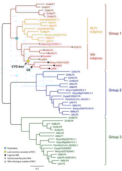 Phylogenetic tree of NIN and NLPs. The tree comprises 53 NIN/NLPs from Zea mays (Zm), Oryza sativa (Os), Solanum lycopersicum (Solyc), Arabidopsis thaliana (At), Casuarina glauca (Casgl/Cg), Parasponia andersonii (Pan), Mimosa pudica (Mimpu) Medicago truncatula (Mt) and Lotus japonicus (Lj). These NIN/NLPs are divided into three orthogroups as indicated. Dicots of Group 1 most likely undergo duplication (blue star), which generates NIN and NLP1 subgroups. The NIN subgroup comprises symbiotic NIN from NFC species (yellow star indicates the last common ancestor of NFC), including NIN of actinorhizal-like plant NIN (hollow circle) and legume NIN (filled circle), and putative NIN orthologues in non-nodulating species outside of NFC (hollow triangle). The CYCLOPs binding site (CYC-box) in the NIN promoter was likely gained by the ancestor of NFC (arrow), whereas cytokinin responsive elements (CE) in the NIN promoter specifically evolved in the legume branch (arrow head). Corresponding accession numbers and protein sequences are listed in the Supplementary Material S1.