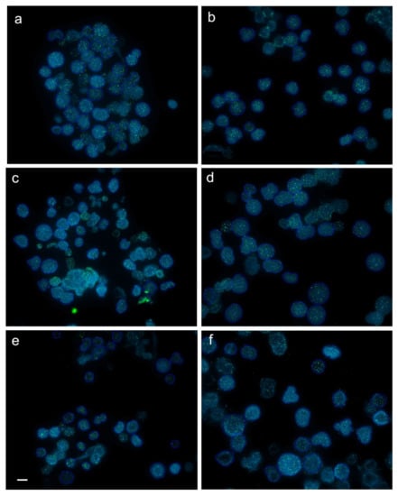 Captured images (frames) with interphase cells from juvenile (a,b), subadult (c,d) and adult (e,f) diploid (a,c,e) and triploid (b,d,f) rainbow trout after fluorescence in situ hybridization (FISH) with PNA (peptide nucleic acid) telomere probe. Average intensity of telomere fluorescence (×10) for cell from the captured frames in juveniles, subadults and adults equaled 18.8 ± 3.3 (a) and 18.3 ± 1.8 (b), 13.7 ± 1.4 (c) and 13.1 ± 1.4 (d), 26.3 ± 5.5 (e) and 19.3 ± 5.6 (f), respectively. Scale bar = 10 µm.