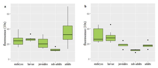 Telomere length-related fluorescence reported in diploid (a) and triploid (b) rainbow trout at different stages of development.