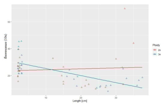 Relationship between telomere length-related fluorescence and body length in the examined triploid (r2 = 0.69, p > 0.05) and diploid (r2 = 0.07) rainbow trout.