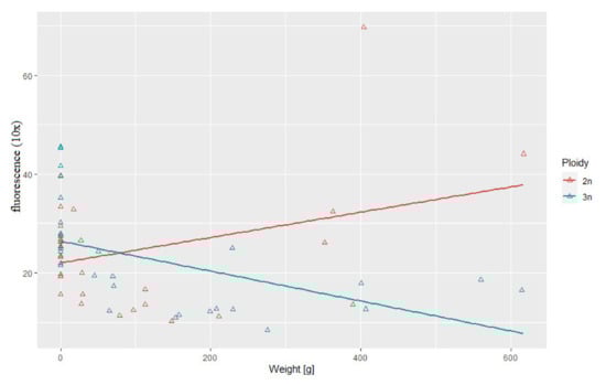 Relationship between telomere length-related fluorescence and body weight observed in examined triploid (r2 = 0.52, p > 0.05) and diploid (r2 = 0.34) rainbow trout.