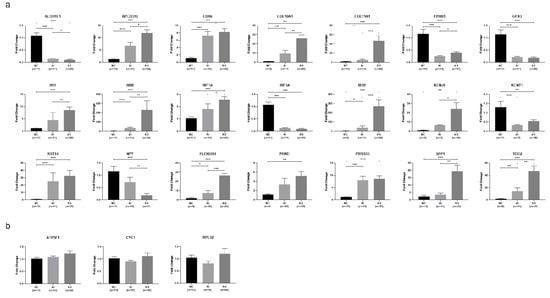 qPCR was performed to confirm the expression of genes identified by RNA sequencing. RNA was extracted as described above. A cDNA library was created from each sample using iScript™ cDNA Synthesis Kit (BIO-RAD, Hercules, CA, USA). Libraries were diluted 10:1 prior to qPCR analysis. TaqMan Gene Expression Assays (Applied Biosystems, Foster City, CA, USA) with FAM™ fluorescent dye reporters were used to quantify expression of our genes of interest (GOI) according to the manufacturer’s instructions. These reactions were multiplexed with the housekeeping gene 18S® TaqMan® Gene Expression Assay with VIC® fluorescent dye reporter to generate cycle threshold (CT) values to calculate relative gene expression using the comparative CT method. The standard protocol for TaqMan® technologies qPCR was performed using the Viia 7 Real-Time PCR System. ΔCT values were calculated for every sample as CTGOI-CT18S. The average ΔCT value was calculated for the NC group. ΔΔCT values were calculated for each sample as ΔCTsample − AverageΔCTNC. Finally, fold change was calculated as 2−ΔΔCT.