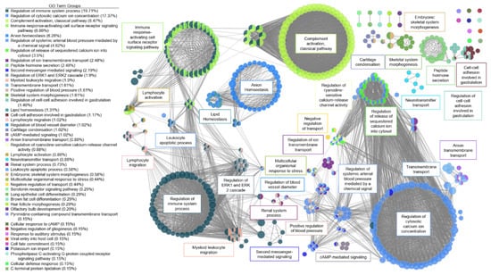 Functional network of genes involved in aortic stenosis. Each node represents a gene ontology (GO) term that has a significant number of differentially expressed genes. Edges represent known associations between GO terms. GO terms are grouped together by similarity and assigned a representative group name. Major clusters for aortic stenosis were ion regulation, immune system response, blood pressure regulation, and lipid homeostasis.
