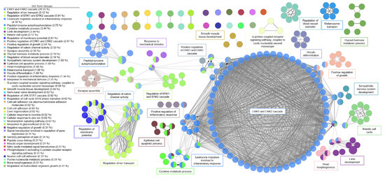 Functional network of genes involved in aortic insufficiency. Each node represents a gene ontology (GO) term that has a significant number of differentially expressed genes. Edges represent known associations between GO terms. GO terms are grouped together by similarity and assigned a representative group name. The major system for aortic insufficiency involved the ERK1 and ERK2 signaling cascade.