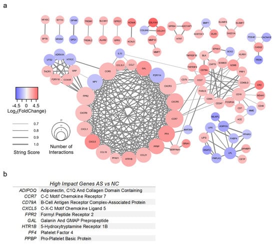 A PPI network was created for AS with 98 genes of interest (Figure 5a). All genes had greater than 3-fold change compared to NC valves, as well as a STRING score of 0.7 or greater. The top nine most impactful genes are listed in Figure 5b. High-impact genes for AS were defined as having (1) 15 or more interactions; (2) >5-fold absolute change; (3) connectivity to surrounding clusters. Genes with greater than 15 interactions were CCR5, CCR7, CXCR3, CXCR5, CXCR6, FPR2, NPY, PF4, and PPBP. The most upregulated genes for AS were COL2A1, COL11A1, CR2, CXCL5, KCNJ6, and PF4. The most downregulated genes for AS were ADIPOQ, DGAT2, GPD1, LPL, MLXIPL, and TRDN. Several genes were identified which bridged gene clusters: ACE, ADIPOQ, CCR7, CD19, CD27, CD40LG, CD79A, FPR2, IL13, MME, and SERPINA1.