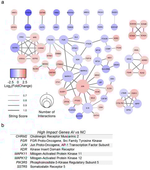 A PPI network was created for AI with 77 genes of interest (Figure 6a). All genes had greater than 1.5-fold change compared to NC valves, as well as a STRING score of 0.7 or greater. The top eight most impactful genes are listed in Figure 6b. High-impact genes for AI were defined as (1) >5 interactions; (2) >2-fold absolute change; (3) connectivity to surrounding cluster. Genes with greater than five interactions were CHRM2, IL10, JUN, KDR, and MAPK11. The most upregulated genes (fold change >2) were CTNNA2, GSTM5, JUN, KSR2, LRRTM1, P2RY1, and SCN4A. The most downregulated genes were HLA-DRB5, LBP, MOV10L1, NOS1AP, S100A8, S100A9, SLC11A1, SSTR5, VNN1, and VNN2. Several genes were identified which bridged gene clusters: CHRM2, CTNNA2, FGR, ITGA2B, JUN, KDR, MAPK11, MAPK12, MT2A, PIK3R5, and PTK2B.