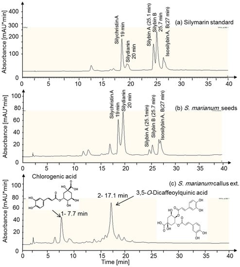 HPLC chromatograms of methanolic extracts. (a) Standard silymarin (SIGMA), (b) Silymarin from Silybum marianum seeds of the Egyptian cultivar, and (c) S. marianum callus derived from cotyledons. Absorbance of fractions was monitored at 288 nm. The separation was performed ≥ three times with similar result.