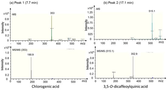 Fragmentation pattern of the peaks 1 (7.7 min) and 2 (17.1 min). (a) ESI-MS and MS/MS in the negative mode of the ion for peak 1 (7.7 min). The obtained m/z values reflect the molecular weight of chlorogenic acid (353). (b) ESI-MS and MS/MS (negative mode) of the ion for peak 2 (17.1 min). The obtained m/z value represent the molecular weight of 3,5-O-dicaffeoylquinic acid (515).