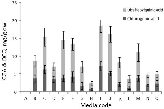 Interestingly, the callus biomass production did not reveal the expected negative correlation with phenolics including CGA+DCQ accumulation, but rather a slightly positive dependency was remarked. Often synthesis of defense compounds negatively affects biomass production as tradeoff, which is not observed in the present study. However, medium I produced the greatest callus weight [] as well as the highest contents of CGA+DCQ. Thus, the well-growing callus conditions tended to produce slightly more CGA+DCQ.