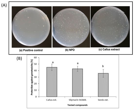 The mutagenicity of NPD was determined in a bacterial reverse mutation assay using S. typhimurium tester strain TA98. Silymarin (SIGMA, Deisenhofen, Germany), callus and silybum marianum seed extracts were tested for protection against genotoxicity of NPD by the pre-incubation method []. Briefly, dry powders of callus and seeds (200 mg) were defatted using petroleum ether and extracted with 95% ethanol. Ethanol was evaporated at room temperature under a hood, and the extracted yellow powder was dissolved in 500 μL ethanol (95%) and the amount of callus peaks was evaluated by HPLC equivalent to dose 284 μg/plate, 1870 μg/plate of silymarin SIGMA and 226 μg/plate of seed extract. Then 50 μL of the stock culture of S. typhimurium TA98 was inoculated in 5 mL of Nutrient Broth medium including 5 μL ampicillin (40 mg/mL), 0.96 μL histidine (26 mM) and 0.5 mL biotin (0.5 mM). The mixture incubated with shaking at 37 °C for 16–18 h. Minimal-Agar plates were supplemented with 25× VBMM (Vogel-Bonner minimal medium) solution, 40% glucose and 40 μg/mL ampicillin. Before use, the plates were treated with 100 μL of 0.5 mM biotin. Agar-agar (6 g/L) dissolved in 1 mL distilled water was heated with 5 g/L NaCl after cooling to about 50 °C, 5 mL of a 0.5 mM histidine/biotin stock solution was added to 50 mL. The Ames test was prepared in 15 mL Greiner tubes containing 400 μL PBS, pH 7.5, mixed with 100 μL S. typhimurium working culture and 50 μL ± test compound (Silymarin or callus extract or seed extract). The culture was incubated at 37 °C for 1 h. After that, a 2 μL genotoxic compound NPD for mutation or 2 μL ethanol as negative control determination were added and incubated for 5 min. The mixture with 2 mL top agar was poured onto agar plates which were incubated at 37 °C for 48 h. After removing the plates from the incubator, colonies were counted with an electronic counter. The results are expressed as revertant colonies per plate. Data derived from six independent experiments.