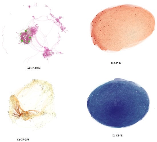 Using the miRsig tool, we built gene coexpression networks with four datasets, two for each C. pseudotuberculosis strain; Table 1 shows the sizes of these datasets. For the whole genome expressed datasets, we predicted a network with 86,367 gene-gene interactions for Cp-13, 9376 interactions for CP-258, 6682 for CP-1002, and 107,202 for CP-T1 (Figure 1). For the differentially expressed networks, we predicted a total of 46 gene-gene interactions for CP-13, 165 interactions for CP-258, 155 for CP-1002, and 98 for CP-T1. The whole genome and differentially expressed genes networks are provided in the Supplementary File 1: Datasheet 1 and Datasheet 2.