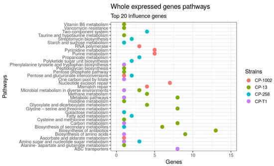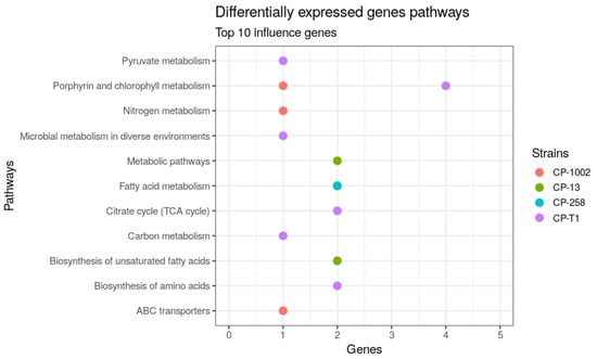 For the top 10 influential genes from the differentially expressed genes’ networks, we found that the metabolic pathway was the more activated one in all strains. Other pathways with more representation in the strains were biosynthesis of antibiotics, microbial metabolism in diverse environments, biosynthesis of secondary metabolites, ABC transporters, and carbon metabolism. The figures are in Supplementary File 2, Figures S6–S9.