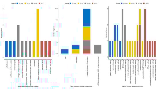 In addition, coders were identified in relation to cell adhesion: the Cp1002B_RS02920 (CP-1002), Cp1002B_RS10840, and CP258_RS03105 (CP-258) genes. These genes encode adhesive proteins that are important for binding the receptor to host cells during pathogenesis. For example, Escherichia coli PapG adhesin from pilus P is necessary for binding to the human renal receptor during the pathogenesis of pyelonephritis [].