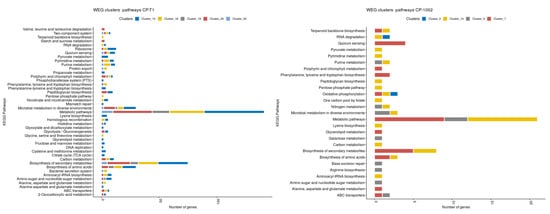 In the clusters with causal genes, we performed gene enrichment analysis using the clusterProfiler package to identify the KEGG pathways in these clusters. Figure 5 shows the pathways involved in the clusters from the whole expressed genes network in CP-13 and CP-1002; the other clusters’ figures are in Supplementary File 2, Figures S4 (CP-258) and S5 (CP-13). The more representative pathways in the clusters in all the strains were metabolic pathways and biosynthesis of secondary metabolites, which were present in almost all the clusters of the studied genomes. Other interesting pathways activated by the causal genes in these clusters were biosynthesis of amino acids, microbial metabolism in diverse environments, quorum sensing, ribosome, and carbon metabolism metabolites.