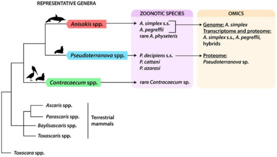Simplified phylogeny of anisakids, with indications of zoonotic species and available omics data. Simplified phylogenetic relationships of anisakids, modified from the last updated inference based on the entire mitochondrial (mtDNA) [11] can be seen in Figure 1; other phylogenetically related ascaridoids of terrestrial mammals are included as sister groups. Indications of final host affiliation for anisakids are reported above the branches (cetaceans, pinnipeds, and fish-eating birds). References of omic studies are reported in the text and in Table 2.