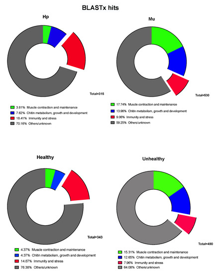 3.1. Differentially Expressed Genes between Hepatopancreas and Muscle (Hp x Mu) Tissues