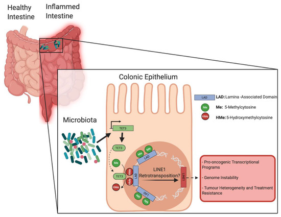 Interestingly, TET enzymes have previously been implicated in immune cell regulation and colonocyte differentiation [12,13], making their involvement in colonic inflammatory responses in relation to microbial interference no surprise. However, TET family proteins have also been implicated in CRC development, as their dysregulation can alter the epigenetic landscape in colonocytes to promote malignant transformation [12]. TET enzymes were extensively linked to the regulation of pluripotency and self-renewal, two key features of cancer stem cells and hierarchical tumor heterogeneity [14,15]. DNA hypomethylation has also been associated with the increased mobility of transposable elements, which constitute a large proportion of the eukaryotic genome and are maintained inactive by DNA methylation in normal somatic cells [16]. In particular, long interspersed element-1 (LINE1) represents a family of autonomous transposable elements, identified as drivers of tumorigenesis upon demethylation-induced reactivation and insertion/transposition, causing profound transcriptional changes and genomic instability [17]. LINE1 was specifically linked to the maintenance of pluripotency gene networks, tumor initiation events, and the establishment of hierarchical heterogeneity in solid tumors, including CRC [18,19,20,21]. Interestingly, LINE1 transposable elements are enriched in the nuclear periphery and lamina-associated domains, making them potential candidates to be affected by microbiota-induced demethylation and further reactivation [18] (Figure 1). Moreover, TET enzymes were shown to demethylate LINE1 transposable elements in various contexts, including pluripotency and other early phases of development [22]. In particular, TET3-dependent demethylation of transposable elements is specifically involved in epigenetic reprogramming, such as observed in cancer initiation [22,23]. Thus, TET-dependent demethylation of LINE1 elements located in lamina-associated domains, upon colonic cell exposure to microbiota, could represent a first step in pro-oncogenic epigenome reprogramming, facilitating transformation and genome instability.