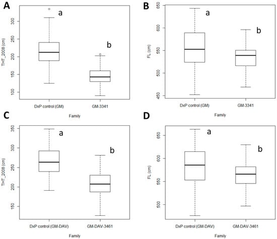 The boxplots represent median values, percentile 25–75 for trunk height measured in 2008 (THT_2008) and frond length (FL) between families. (A) THT_2008 comparison between the DxP control and the GM-3341 family in the PT132 trial in the East Estate; (B) FL comparison between the DxP control and the GM-3341 family in the PT132 trial in the East Estate; (C) THT_2008 comparison between the DxP control and the GM-DAV-3461 family in PT138 in the North Estate; (D) FL comparison between the DxP control and the GM-DAV-3461 family in PT138 in the North Estate. The trait comparisons were analyzed based on two-sample t test at the p = 0.05 threshold.