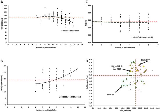 Cumulative effects of quantitative trait alleles for (A) THT_2008, (B) O/P, (C) FL traits, and (D) the application for selection of THT_2008 and O/P traits in the GM-3341 Family. Red dotted line—mean THT_2008 (145.07 cm), mean O/P (19.50 kg/palm/ year) and mean FL (534.53 cm); orange dot—High O/P and low THT_2008, red triangle—High O/P, green diamond—Low THT_2008; multiple trait selection in Figure 3D based on threshold numbers of positive alleles for THT_2008 = 13 and for O/P = 7.