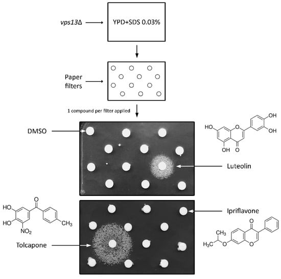 We have previously described that the yeast vps13Δ mutant exhibits SDS hypersensitivity and showed that this phenotype has the potential for drug screening []. In this study, we adapted this phenotype for drug screening assays (Figure 1) [], in order to identify molecules preventing the lethality caused by VPS13 deletion. As SDS is inherently toxic, compounds reducing its toxic properties could also be identified and, thus, the other phenotype—cadmium sensitivity—was subsequently tested (see below). We screened the Prestwick drug repurposing library (Prestwick Chemical) previously used in such screens [,], which contains drugs accepted for use in humans. Active compounds were identified after 3–5 days by the observation of growth zones around the filter. Their activity was then confirmed in independent experiments. Seven drugs were identified as suppressors of vps13∆ growth defect and two showing some structural similarities were selected for further analysis: luteolin, a naturally occurring flavonoid present in many fruits and vegetables, and tolcapone, a drug used to treat PD, which is a reversible nitrocatechol-type inhibitor of catechol-O-methyltransferase [] (Figure 1). Another flavonoid present in the Prestwick library, ipriflavone, was not active (Figure 1). To elucidate the structural determinants important for activity, we performed further analyses (see below).