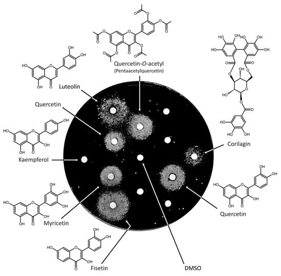 Identification of luteolin as a suppressor of vps13Δ growth defect prompted us to screen an in-house library of natural compounds and their derivatives, in order to evaluate further the efficacy of these compounds as chemical suppressors of vps13Δ growth defect in the presence of SDS. Of about fifty compounds tested (Table S2), five—namely, quercetin, pentaacetylquercetin, myricetin, fisetin, and corilagin—were shown to restore vps13Δ growth on SDS plates (Figure 2). Among all positive-acting drugs, luteolin caused the largest growth zone (Figure S1). Quercetin, myricetin, and fisetin belong to the group of flavonoids with hydroxyl groups positioned in different carbons of the 3-hydroxyflavone backbone. Pentaacetylquercetin can be deacetylated to quercetin and the activity we observed may have been derived from this active metabolite. Corilagin is a member of the group of hydrolysable tannins, which have a complex structure. Kaempferol, which also belongs to the group of flavonoids, was not active (Figure 2). The identified flavonoids were also active as chemical suppressors of cadmium hypersensitivity of vps13Δ cells; furthermore, they also improved the growth of the wild-type strain (Figure S2). Thus, we further focused on SAR analysis of flavonoids.