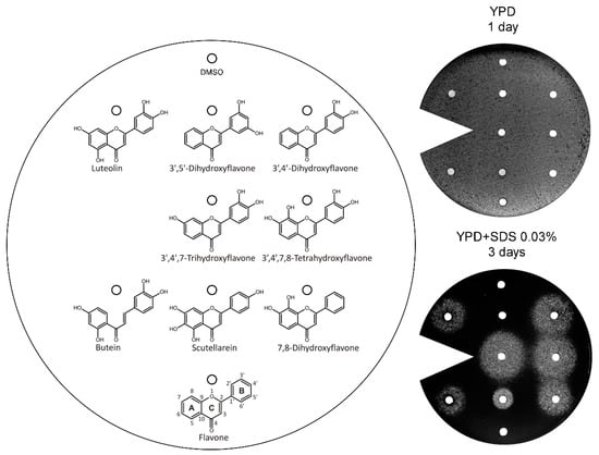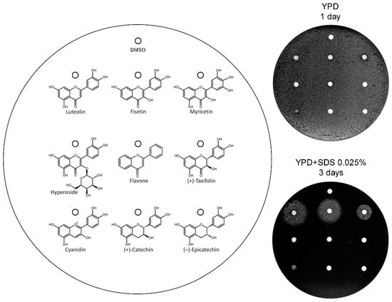 The in-house library of natural compounds and their derivatives (Table S2 []) was composed from 5 μg/μL stocks in DMSO. An over-night pre-inoculum of vps13Δ strain was refreshed and incubated in the shaker at 28 °C for 5 h. Samples corresponding to OD600 0.2 were taken, diluted to a final volume of 250 μL, and spread onto YPD for control and YPD 0.03% SDS medium plates (14 cm round or 12 × 12 cm square). Compounds from the library were applied on filter discs (10, 20, and 30 μg per spot). Mock-treated cells (DMSO solvent only) served as negative control, and luteolin (identified in a drug screen of Prestwick library, described above) as positive control. The plates were incubated at 28 °C for 3 to 5 days. Structure–activity relationship (SAR) analysis was carried out by testing sets of compounds of various structures (Table S2). For SAR, 30 mg of compounds were spotted on filter discs put on YPD, YPD + SDS 0.025%, and YPD + SDS 0.03% solid media with plated vps13Δ strain and observed after 3 to 7 days.